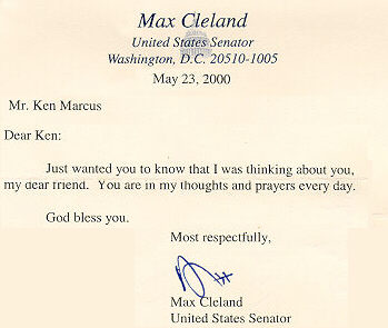 I normally do not pay much attention to politics, but my relationship with senator Max Cleland spans the last four or five years. He is a true American and a tremendous inspiration to anyone who is handicapped. He lost an arm and a leg in Vietnam, shook that off, and became President Jimmy Carter's head of the Veteran's Administration. Besides being a charming, positive thinker, he shares many of my beliefs - equality for women in the workplace, adequate health care for aging indigent Americans, and above all, he is a staunch advocate for free enterprise and small business. God bless you Max! The following is a letter I received from Senator Cleland while in the hospital. His thoughts and prayers, along with all of the support I received from everyone else, sustained me through my paralysis where no amount of money would have helped.